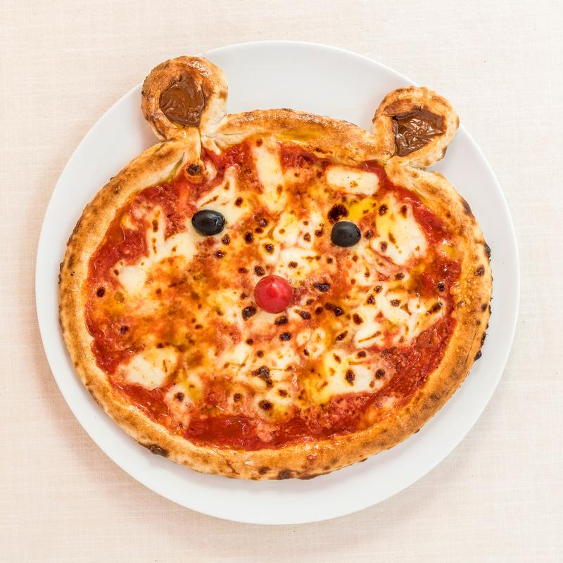 Bear-shaped pizza with Nutella ears. ― チーズピッツァ(クマの耳の部分にヌテラが使用されています)