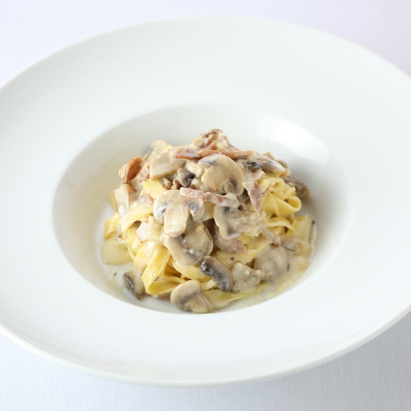 Fresh tagliatelle, prosciutto di parma, mixed mushrooms, parmigiano reggiano cream sauce-キノコと生ハムのクリームソース タリアテッレパスタ
